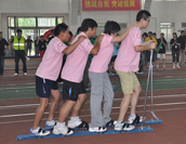 比赛开始前,4名队员托举比赛器材过肩立于起跑线后。裁判发令后,4名队员通过协调配合使比赛器材在跑道上