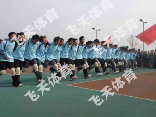 10人一组,两组一队进行比赛,用绳子绑住一条腿,从起点跑到终点再返回,用时少者获胜。